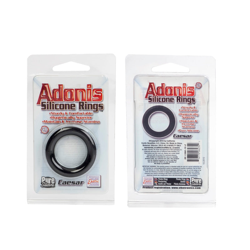 - Made from pure silicone that creates a firm grip while warming to body temperature for a natural feel, Adonis Silicone Rings are sturdy, comfortable and ultra effective. Cock rings work by keeping blood in the penis once its erect, they can also help with endurance, since the slightly constricted sensation helps to keep the wearer under control. For whoever's on the receiving end, a ring can provide extra stimulation to the clit or perineum, since it'll add a little more surface area and extra texture. The Caesar version of the Adonis ring is subtly ridged, extra stretchy and super smooth, plus, as mentioned, it'll warm to body temperature with use, making it feel natural for both partners. The high-end pure silicone is extremely hygienic, with a nonporous surface that's very easy to clean and sterilize; silicone is also hypoallergenic and body friendly, perfect for anyone with sensitive skin. Use a good quality water-based lube if needed with the Adonis rings to keep the material strong. Fits most.