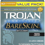 Trojan Brand Latex Condoms 24 count box. Get closer. Trojan Bare Skin the thinnest latex condom ever. Trojan Sensitivity Bare skin 40% thinner than the standard Trojan condom. Silky Smooth Lubricant for comfort and sensitivity. Premium low-odor latex to help ensure reliability and reduce the risk of pregnancy and sexually transmitted diseases and infections. Each latex condom is electronically tested and meets U.S. standards for strength to help ensure reliability. Trojan Condoms for contraception, birth control and disease prevention. Trojan America's number one trusted condom for over 90 years.