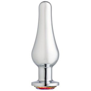 Cloud 9 Gems Silver Chrome Tall Anal Plug Large. New Gems Silver Chromed Anal Plug Tall Tapered Design. Plug with anal jewelry decorated with a stunning rainbow multicolored gem. Hypoallergenic, nonporous, odorless and body safe. Tapered for intense pleasure. Great for beginners. Anal Jewelry decorated with a stunning rainbow multicolor gem. Silver chromed wearable plug featuring a jeweled beauty for your booty. Cloud 9 Jeweled Gems. Features a delicate tapered tip. Perfect for beginner use. Hypoallergenic, nonporous, odorless, and body safe. The tapered tip makes it easy to insert, and the flared base keeps its place and allows for easy retrieval. The sparkling jewel makes playtime fun. This Cloud 9 Jeweled Anal Plug is excellent for temperature play when you prepare it in hot or cold water. This Cloud 9 Gem anal plug is both visually stunning and ideal for stimulating anal play. Compatible with water based lubricants. Clean with mild soap and warm water after use. Smooth, solid stainless steel in design, jewel adornment. Chrome Plated Stainless Steel & Acrylic Gem. Great for temperature play. Anal Jewelry decorated with a stunning rainbow multicolor gem. Body safe Stainless Steel and Acrylic Gem. Great for temperature play Weight .43 pound. Height 5.11 inches, diameter 1.64 inches.