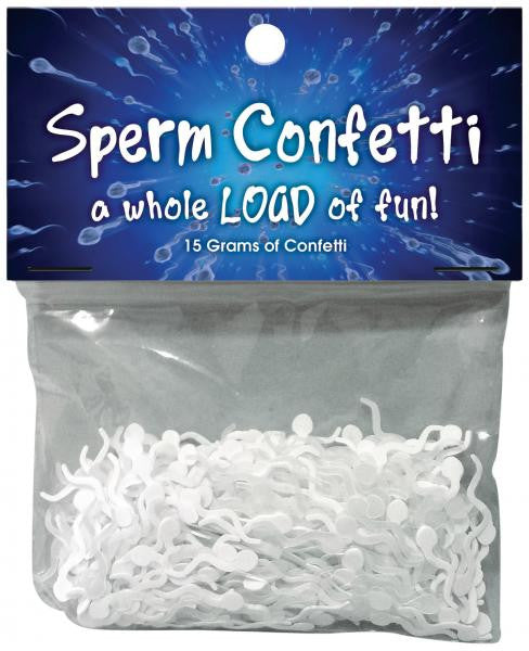 Sperm Shaped Confetti. A whole load of fun! Fling it at someone you love, unload on your friends, frost an adult cake, spooge on someone's desk, shock your in laws, use in a two weeks' notice, give your roommate a wet dream, or buy several and go nuts Includes: 15 grams e or approximately .52 ounce of sperm shaped confetti. Color White.