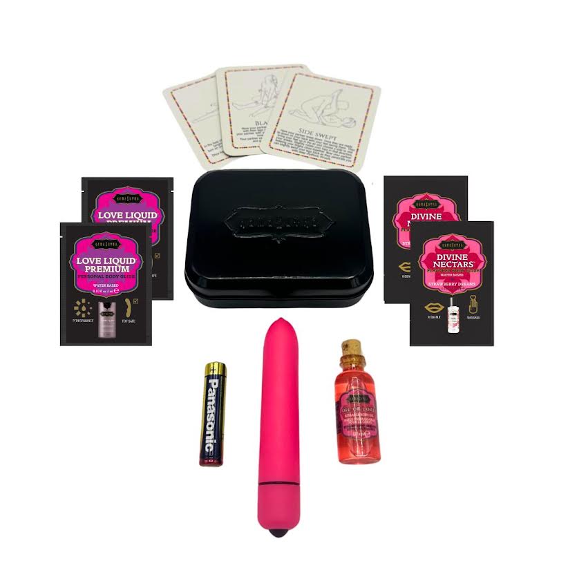 Be ready for spontaneous fun with the perfect mix of Kama Sutra luxuries and a battery powered mini vibe with 10 vibration settings. Perfect portions fit comfortably in a pocket, luggage, bag or purse for a weekend away or anytime the mood strikes. MINI BULLET VIBE: This powerful bullet delivers tingling vibrations directly to your most sensitive erogenous zones. This small but mighty bullet is quiet, discreet in size (3.54″ L), and offers a range of fun sensations for you to enjoy alone or with a partner. Includes 1 AAA battery, OIL OF LOVE: Kissable, warming, water-based body topping. Size: 0.20 fl oz (6 ml). 2 DIVINE NECTARS Packets: Delicious flavored, water-based lube perfect for oral sex and more. 0.10 fl oz (3 ml). 2 LOVE LIQUID Classic Packets: Personal, water-based lubricant. Size: 0.10 fl oz (3 ml). EROTIC PLAY CARDS: 3 play cards with Kama Sutra positions for inspiration.