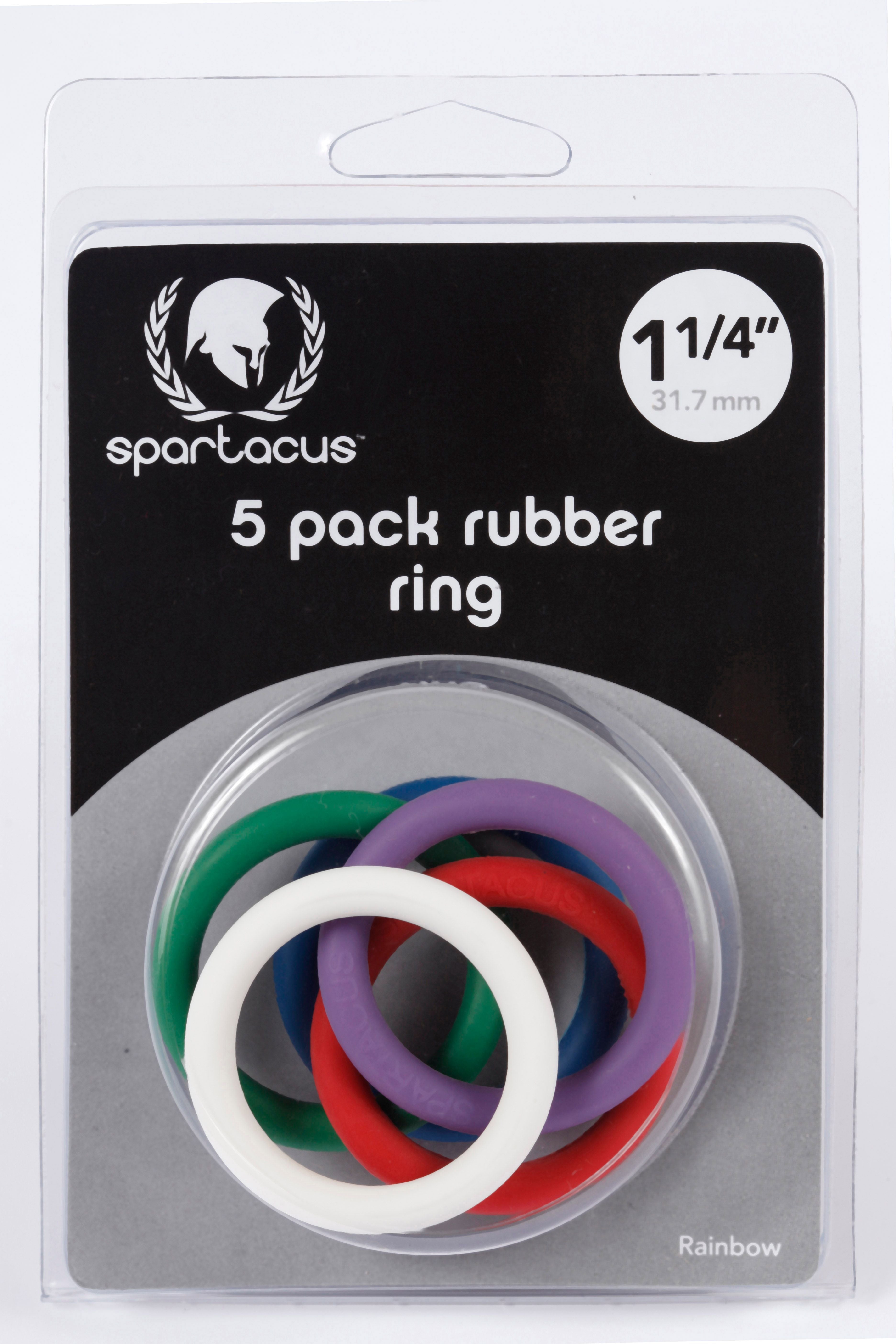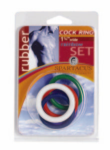 Spartacus Leathers Cock Gear Rubber Cock Rings Rainbow Rubber 5 Pack includes blue, green, purple, red and white cock rings in a single size. 1.25 inches Soft Rubber Cock Rings Rainbow accessorize any outfit with this set of cock rings. What fun! When worn around the base of the penis and testicles, many users find that cock rings increase sexual pleasure. Prolong rings, erection enhancement, climax control rings, cock rings. Rubber cock rings in your choice of colors. Each Rainbow rubber five pack includes blue, green, purple red and white cock rings in a single size 1.25 inches.