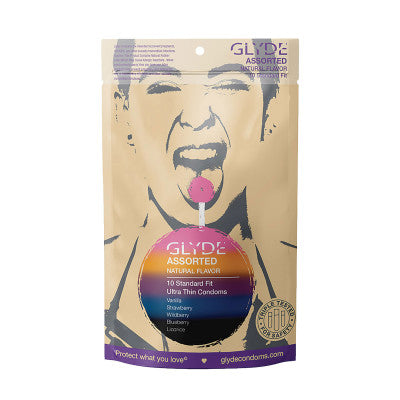 Will it be succulent strawberry, subtle vanilla or fresh blueberry? Our GLYDE ULTRA Organic Flavors Sampler is an excellent way to discover which of our five delicious flavors turn you on. When creating the world's most delicious, flavored condoms, we ignored cheap chemical concoctions and sourced the highest quality food-grade natural and organic fruit extracts available. GLYDE ULTRA Organic Flavored standard-fit (medium) condoms are sized to fit most men, ultra-thin to maximize sensation, and made with our natural plant-based formula of natural rubber latex and thistle extract. Our double-washing process eliminates the unpleasant latex taste and odor found with conventional brands. The first condom brand certified ethical, vegan & Fair Trade, GLYDE delivers exceptional performance and pleasure for both partners. You'll both feel the difference. Each sampler contains one of each mouthwatering FLAVORS: Strawberry, Blueberry, Licorice, Vanilla and Wildberry.