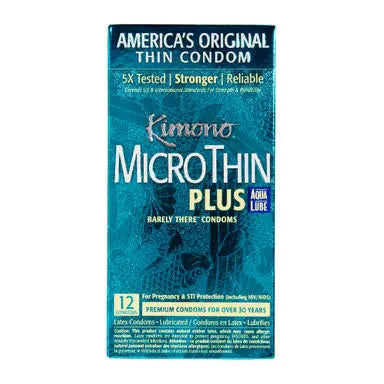 Kimono Condoms - America's Original Thin Condoms. 5X tested stronger, reliable. Exceeds US and International Standards for Strength and Reliability! Kimono Microthin with Aqua Lube Condoms 12 Pack. Kimono's thinnest condom combined with their water-based lubricant. Aqua Lube is pH balanced, non-staining and long lasting. Aqua Lube effectively combines with the body's natural lubrication creating instant excitement for both of you. Pre-lubricated with their special proprietary AquaLube, these Kimono MicroThin condoms offer a superior barely there feel that is 20% thinner than a leading competitor's thin condom! The cool, refreshing moisture of Aqua Lube promotes a more comfortable and sensually slick experience each time you slide one of these form-fitting condoms on. Kimono MicroThin feels like wearing nothing at all, and promotes more intense sensations during lovemaking, while still ensuring protection against STDs and unwanted pregnancy. These ultra-thin latex condoms are giving a sexy twist to staying safe between the sheets! Type: Latex Condoms Material: Latex Pack: 12 Condoms Special Features: Aqua Lube Lubricated, Ultra-Thin. Safe sex practice, birth control, disease prevention, pregnancy prevent. Sexual wellness. Always practice safe sex. Kimono Condoms are all natural, vegan friendly and no animal or milk proteins. Caution: this product contains natural rubber latex, which may cause allergic reactions.