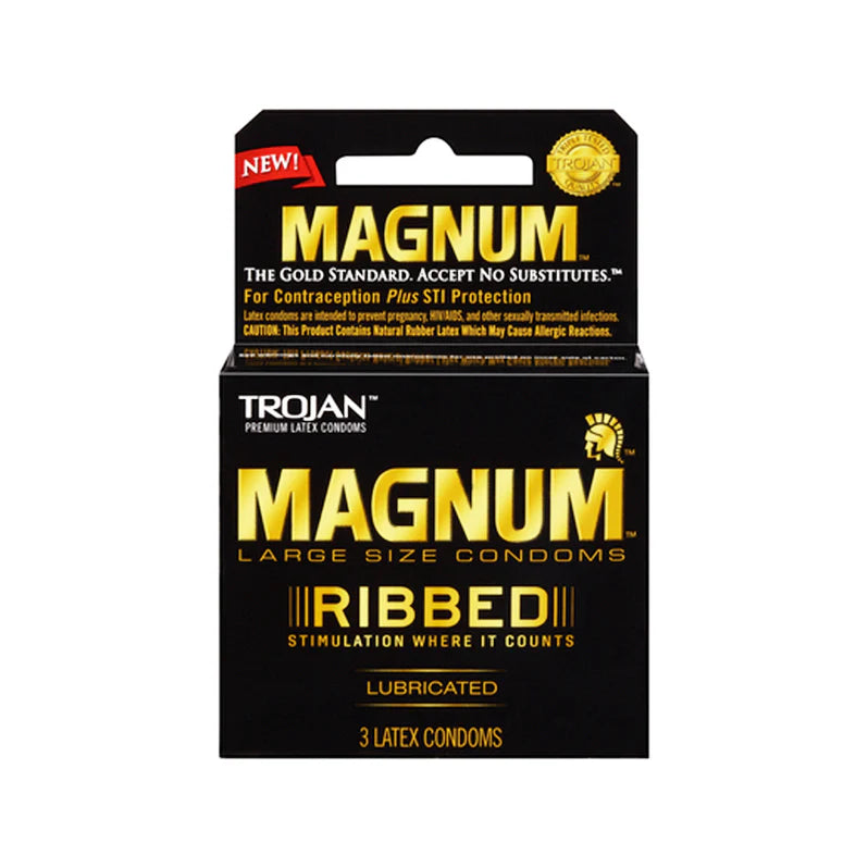 Magnum Ribbed condoms are designed to provide heightened stimulation for both partners. Spiral ribbing towards the tip for him. Spiral ribbing towards the open end for her. Trojan Brand Condom Magnum Ribbed 3 Package Condoms are designed to provide heightened stimulation for both partners. Spiral ribbing towards the tip to increase stimulation for the most sensitive area. Spiral ribbing towards the open end to increase stimulation for her most sensitive area. Larger than standard size latex condoms for extra comfort. Silky smooth lubricant for comfort and sensitivity. Trojan Magnum Ribbed Condoms are designed to provide heightened stimulation for both partners. Spiral ribbing towards the tip to increase stimulation for the most sensitive area. Spiral ribbing towards the open end to increase stimulation for her most sensitive area. This larger than standard latex condoms for extra comfort with silky smooth lubricant for comfort and sensitivity. Made from premium quality latex to help reduce the risk. Each condom is electronically tested to help ensure reliability. Made from premium quality latex to help reduce the risk of sexually transmitted diseases and unwanted pregnancy. Each condom is electronically tested to help ensure reliability.