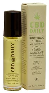 Earthly Body Soothing Serum 10ml e or approximately .34 fluid ounce Roller Ball Bottle. We took our CBD Daily Soothing Serum and made it in a handy travel size! This new roller ball application makes it easy to apply serum while on the go. Packed with powerful Hemp CBD and no THC! Ultra concentrated. Features Natural Hemp CBD. Leaping Bunny Certified. 100% Vegan. Non-Psychoactive.THC-Free. Directions massage small amount directly onto skin 3 to 5 times a day. Store in a cool place or at room temperature. Ingredients Glycine Soja Soybean Oil, Prunus Armeniaca Apricot Kernel Oil, Cannabis Sativa Hemp Seed Oil, Persea Gratissima Avocado Oil, Tocopherol Vitamin E, Basilicum Basil Oil, Melaleuca Viridiflora Niaouli Oil, Eucalyptus Globulus Oil, Pinus Sylvestris Pine Oil, Lavandula Vera Lavender Oil, Cedrus Altantica Cedarwood Oil, Mentha Peperita Peppermint Oil, Menthol, Simmondsia Chinensis Jojoba Seed Oil, Cocos Nucifera Coconut Oil, Hemp Extract. Made in the USA.