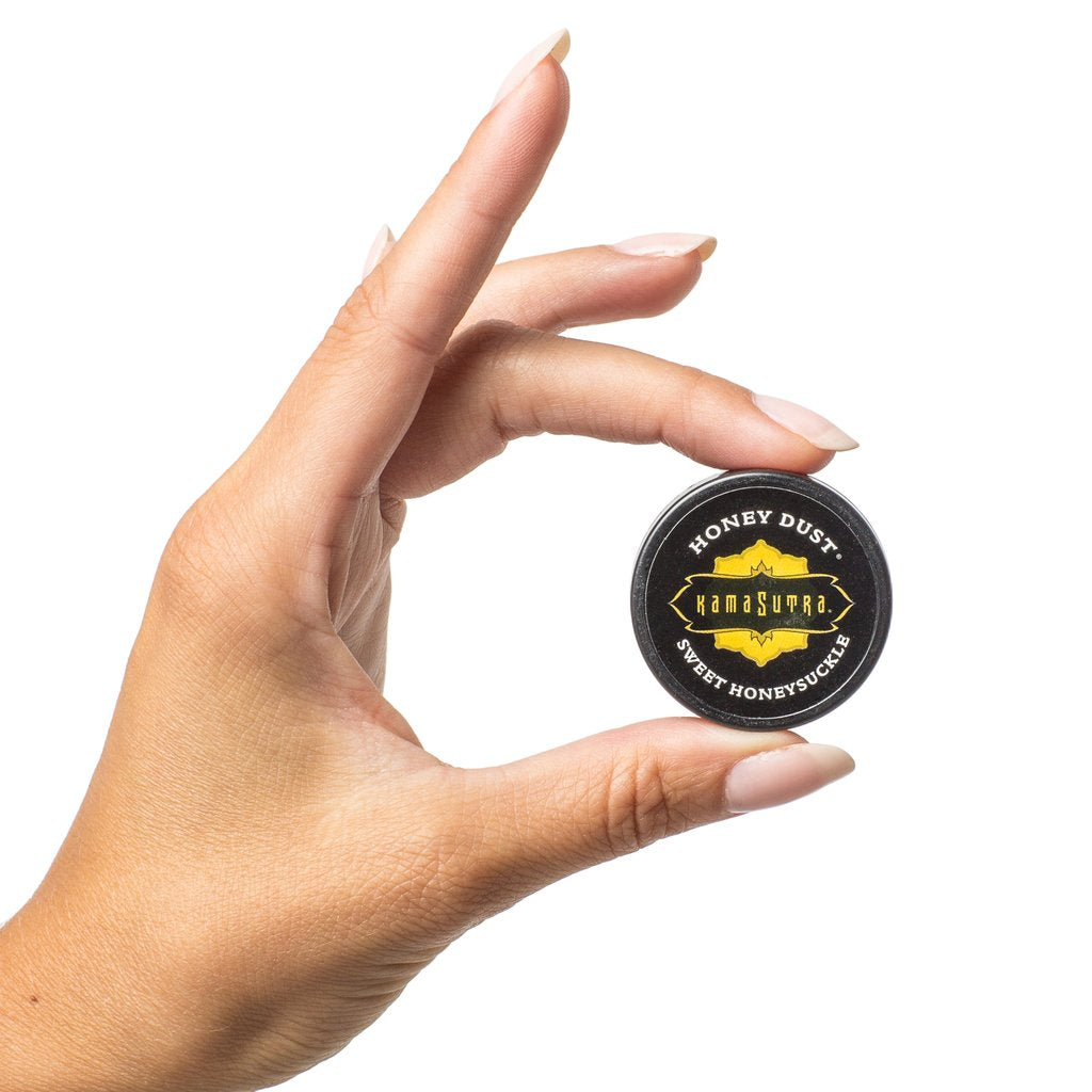 HONEY DUST: Kissable body powder with feather tickler for application. Size: 0.125 oz (3.5 g).