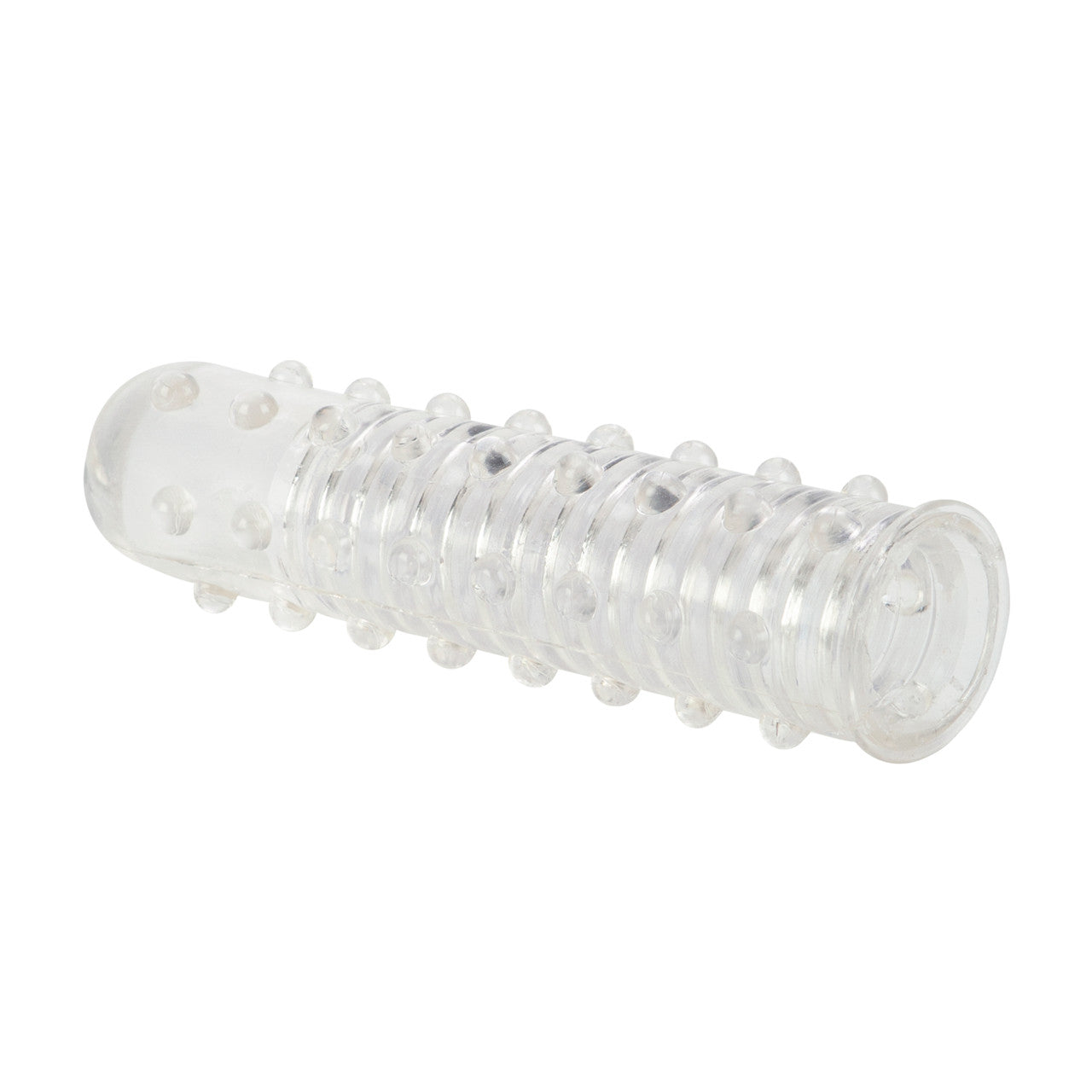 Glow-In-The-Dark Reversible Sleeves from California Exotic Novelties. Enjoy double the orgasmic ecstasy with the versatile Reversible Sleeve. The multi-purpose Reversible Stimulator Sleeve is designed for heightened sensual pleasure and mind-blowing orgasmic satisfaction. The textured, fully Reversible Sleeve is suitable for direct Penis application and stimulation and for use with your favorite vibrator. Select your preferred mode of use and tantalizing pleasure nodule side and enjoy unlimited sensual pleasure. The Reversible Sleeve is made from soft and super stretchy unscented Thermoplastic Rubber TPR. The transparent Reversible Sleeve features pleasure ridges on one side and sensual nubs and nodules on the reverse, for ultimate stimulation ecstasy. Slide the Sleeve directly over the erect Penis for instant mutual arousal and heightened sensitivity. For solo exploration fun, glide the textured sleeve over your favorite vibrator and instantly elevate your erotic experience. Power up the vibrator and indulge in unlimited fun. Suitable for first time and experienced users, the top-quality Reversible Sleeve is a great way for spicing things up. The versatile Universal Sleeve makes an ideal addition to your intimate toy collection, inspiring wild secret fantasy play. To intensify the tantalizing tingles and sensations, always use a water-based lubricant with this sex toy. Before and after every use, clean the stimulator Sleeve with a toy cleaner spray or warm, soapy water. Rinse with warm water. Pat dry before storing. Reversible universal sleeve with ridges and pleasure nodules. Use on a Penis or Vibrator. Soft, stretchy, unscented materials. Sleeve measures 5.5 inches long by 1.2 inches wide. Bulk Weight: 1.4 ounces. Safe and pure for body and pleasure. Made using phthalate free, non-toxic materials: Thermoplastic Rubber TPR. Penis extensions.