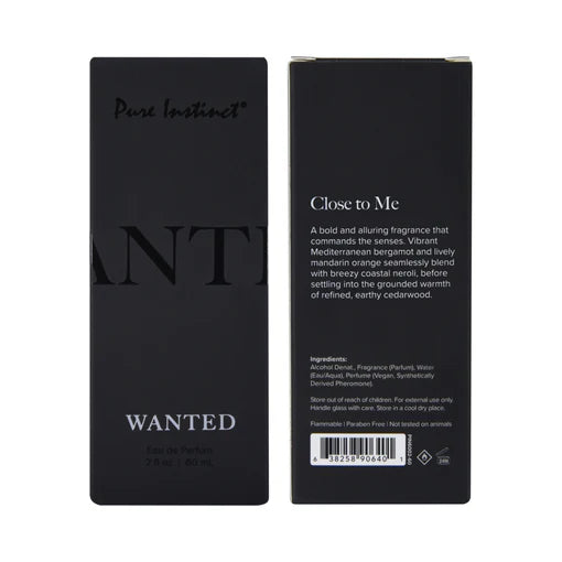 Pure Instinct Pheromone Eau De Parfum Wanted. A bold and alluring fragrance that commands the senses. Vibrant Mediterranean bergamot and lively mandarin orange seamlessly blend with breezy coastal neroli, before settling into the grounded warmth of refined, earthy cedarwood.
