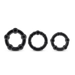Blush Novelties Stay Hard exclusive toys for big boys. High quality luxury adult toys for every body type and feel. Blush Novelties exclusive product line will blow you away. Beaded Cock Rings Black. For super hard erections. May aid in delaying ejaculation. Perform like the stud you are! These Stay Hard Cock Rings come in 3 sizes, so you can use them individually or all 3 at once. The Small Ring is for maximum erections. Medium Ring is for hard erections; Large Ring can be used to encircle the upper part of your scrotum to help prevent premature ejaculation. They are made of Elastomer, a super stretchy, comfortable and Phthalate Free material developed specifically for your safety and hygiene during your intimate play. So, if you are looking for a safe way to increase both in size and stamina, you and your partner are sure to enjoy Blush Novelties Stay Hard Cock Ring and your bigger, better erection that lasts even longer! Specification: 3 sizes. Super stretchy and strong rings. Beaded for extra stimulation. Made from pure and body safe Elastomer. Phthalates and latex free. Width cock ring I: 1.4 inches. Width cock ring II: 1.27 inches. Width cock ring III: 1.18 inches. Weight: 0.2 ounce. How to use: Motion place the ring at the tip of an erect or semi erect penis, roll the ring down to the base of the penis. Adjust the ring for comfort reverse steps to remove. Motion II stretch the ring and secure to the base of the penis. Adjust the ring for comfort, reverse steps to remove. Motion III stretch the ring and slip each testicle through the ring bend the tip of an erect or semi erect penis and push/pull through the ring. Adjust the ring for comfort. Reverse steps to remove. Cleanse and care: run water and apply a mild soap or wipe with a choice toy cleaner, then let air dry. Do not wear a cock ring for more than 30 minutes. Cock rings give you a longer lasting erection by trapping the blood supply in the penis and intensify orgasms. Cock rings are ideal for men with premature ejaculation or erectile dysfunction. There are no guaranteed results from cock ring usage.