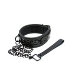 Sinful Black Collar one size fits most. Sinful has been the name in affordable playful kink. Now, Sinful just made sexy a little bit sexier! NS Novelties is excited to introduce Sinful: Black. Everyone's favorite collection is now available in a stunning midnight black finish while continuing to deliver the quality you expect. Black, nickel free anodized hardware, aesthetically striking embossed vinyl, and lined in soft yet durable liquid play friendly neoprene.
