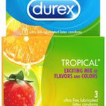 A sweet twist to oral sex, the Durex Tropical Condoms exciting mix of flavors and colors. 3 pack latex condoms is an assortment that features a selection of 3 random colored condoms. Each with a tasty flavored and fragrance lubricant to enhance your oral pleasures and sexual encounters. Electronically tested for durability, each condom features a great fit, low latex odor, and a sexy surprise flavor and scent to surprise your lover. Ultra fine lubricated latex condoms. Color assorted. Type: condom. Pack: 3. Special Features: Lubricated, Flavored, Colored, Scented.