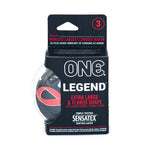 ONE® Legend™ permite a los hombres de talla grande disfrutar sin dejar de estar protegidos. Su forma acampanada y fácil de enrollar añade mayor comodidad. Incluye un estuche de plástico que puede contener hasta cuatro preservativos Más largos y anchos que los preservativos ONE® normales Forma de placer - Más espacioso en la punta Lubricante de silicona de primera calidad Punta con depósito Anchura media en la base: 56 +/- 2 mm Anchura media en la cabeza: 61 mm Anchura media en el centro: 58,5 mm Longitud media: 226 mm