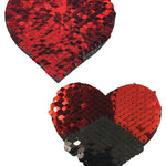Red and Black Color Changing Sequin Heart Nipple Pasties by Pastease are hand made in the USA of reversible sequin material that forms to curves and resists wrinkling over hardening nipples. Just peel and stick on clean, dry skin! All Pastease pasties feature latex free, medical grade, waterproof adhesive that stays securely in place for as long as you like and until they are gently removed. Conceal or reveal with Pastease nipple pasties when worn with a sexy outfit, daring bikini, sheer top, revealing dress, hefty bag, body lotion, crazy costume, party theme or nothing at all! Dimensions 3 inches wide by 2.5 inches tall. Coverage 1.8 inches. Pastease are the fun maker that brings out your inner tease! Pastease Brands - Hearts. New primary image package. Categories: Lingerie, Clothing, Valentine's Day, Pasties and Accessories, Holiday Items. Restricted, Amazon Restricted.