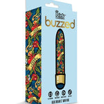 Prints Charming Buzzed 5 inches Mini Vibe Blue Dream from Global Novelties. Classic smooth vibrator with fun vibrant cannabis patterns. Four Twenty print. Ten powerful functions with a silicone inlaid easy push button and illuminated LED control. Waterproof and whisper quiet, body safe and phthalate free materials ABS Plastic Shaft with Silicone Buttons. Storage bag included, zero waste packaging, Vibrator requires 2 AAA batteries, not included.