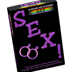 - Each Gay Sex! card explicitly illustrates either a foreplay activity or sexual position. While playing one of the three Gay Sex! card games, you and your lover use the cards to plan out one of the 100,000 possible fantasies.