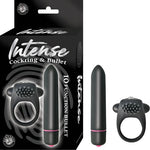Intense Cock Ring y Bullet Vibrator Negro de Nass toys of New York. Bala de 10 funciones y anillo vibrador para el pene es un kit para parejas. Discretamente silencioso. Anillo vibrador para el pene resistente al agua. Libre de ftalatos, cumple con la directiva RoHS. Balas de plástico ABS, anillo para el pene de silicona. Longitud de la bala vibradora 3,5 pulgadas, anillo para el pene 2,125 pulgadas. 1 pila AAA para la bala vibradora, 2 pilas LR41 para el anillo del pene, todo incluido.