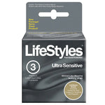 Lifestyles Ultra-Sensitive Condoms. Heat up the passion with ultimate in sensitivity and stimulation. Thin but as strong and safe as other condoms. Specially lubricated to maximize pleasure. Reservoir tip offers extra safety and comfort plus added stimulation both partner's desire. Thin, but still offers the same safety and reliability as standard condoms. Natural color, latex, odor free, and lubricated. Lifestyles Ultra-Sensitive 3 Pack contains 3 individually wrapped latex condoms. Very thin but very strong provides ultra sensitivity. A unique flared shape heightens sensation. Lubricated for a natural feeling. Reservoir tip for added comfort and safety. Talc-free. Made of the highest quality latex. Each condom measures 7.07 inches long by 2.13 inches wide and is very thin .002 inch. Please note the package has changed on this product not the condoms. A condom is a barrier device most commonly used during sexual intercourse to reduce the probability of pregnancy and spreading sexually transmitted diseases, STDs such as gonorrhea, syphilis, and HIV. It is put on a man's erect penis and physically blocks ejaculated semen from entering the body of a sexual partner. Safe sex practice, birth control, disease prevention, pregnancy prevent. Sexual wellness. Always practice safe sex. Gay pride. Lifestyle Condoms from Ansell. A Global brand that is well known and respected for its reliability and proven protection. Ansell holds its operational headquarters in Red Bank, NJ, USA Please note the package has changed on this product not the condoms.