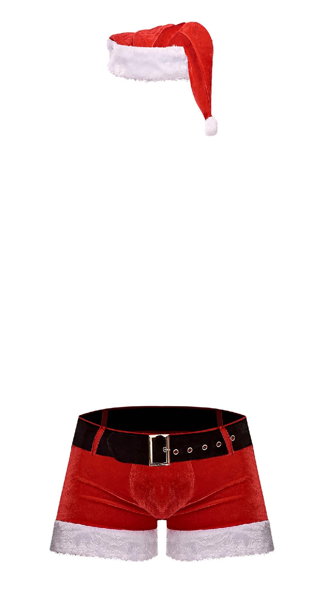- Un pantalón corto estilo Papá Noel con cinturón y adornos de felpa nevada en las piernas y gorro de Papá Noel.