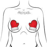 With resistance to wrinkling over hardening nipples and ease in application/removal, these Pastease nipple coverings are composed of latex-free material and will bring some glitter and velvet embellishment to your Christmas swag. Wear these Santa mitten pasties as a titillating tease over a tacky Christmas sweater or under a sexy mesh lace turtleneck at a festive party. These X-mas nipple covers are sure to give you the warm and fuzzies!