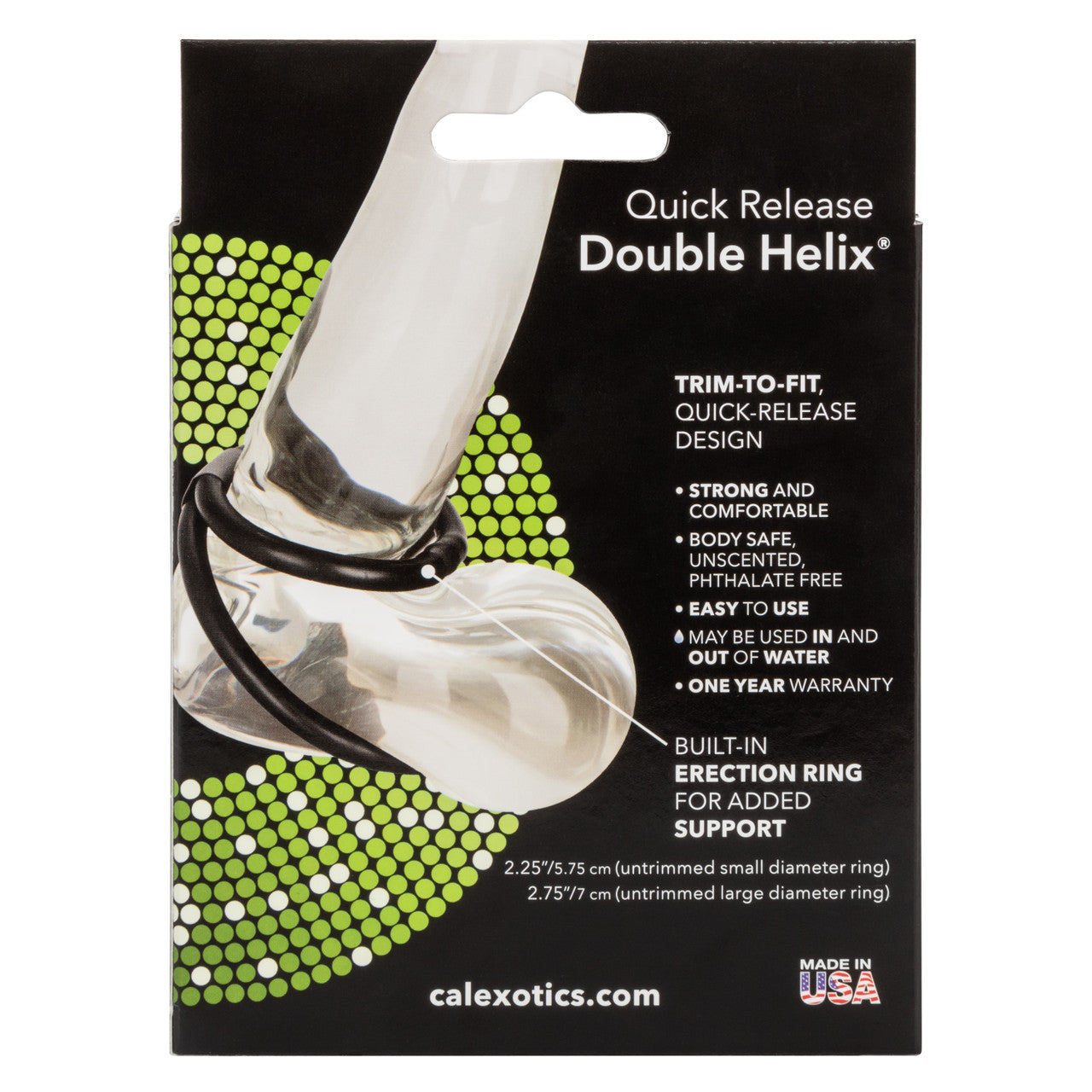 Double Helix Quick Release Erection Enhancer from California Exotic Novelties. Enjoy double the arousal, stimulation, and extended play fun, with the Double Helix Quick Release Erection Enhancer. The easy to use enhancer is designed to offer a sensuous personalized fit for maximized seduction pleasure and a prolonged rock hard performance. Indulge in mind blowing encounters and endless erotic satisfaction every time. The Enhancer is made from soft rubber and features two individual rings that are designed for personalized trim to fit sizing and ensure ultimate comfort for stamina support that goes on and on. To use the Double Helix shaped enhancer, slip the large Ring around the Scrotum and the smaller Ring around the base of the Erect Penis and trim the tubed Rubber bands to size. Securely snap the two ends of each ring together and prepare for tantalizing sensations. Suitable for first time and experienced users, the Enhancer is great for spontaneous exploration. To experience a longer lasting erection, slip the Quick Release Rings on, and enjoy unlimited intimate play. To increase the pleasurable tingles, always use a quality lube with this toy. Before and after every use, remember to clean the Rubber Enhancer Rings with a toy cleaner spray, or wash in warm soapy water. Rinse with warm water. Pat dry before storing. Arouser is a trim to fit Cock Ring. Quick Release Double Erection Enhancer. Safe and pure for body and pleasure. Made using phthalate free, non-toxic materials Rubber. Large Ring measures 2.75 inches in diameter. Small Ring measures 2.25 inches in diameter. Bulk weight 0.4 ounce. Pursuant to 18 U.S.C. 2257, Double Helix was produced on December 12, 1997, and the records required to be kept by that law are available at 14235 Ramona Avenue, Chino, California 91710. Custodian of Records: Susan Colvin. Double Helix is a registered trademark for California Exotic Novelties.