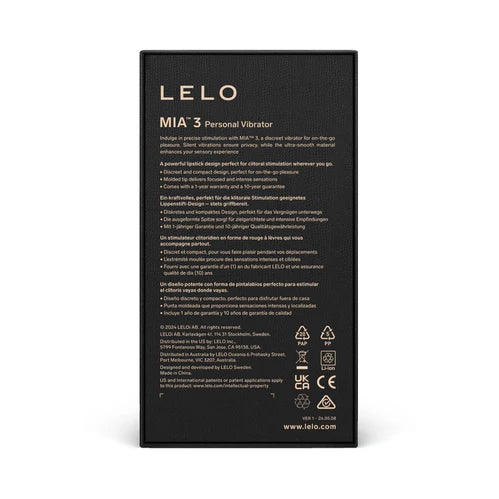 Lelo MIA 3 Black is a discreet personal vibrator designed for ultimate pleasure on the go. Its near-silent vibrations ensure privacy wherever you are, while the ultra-smooth material feels warm to the touch, enhancing your sensory experience. MIA 3's strongest feature is its compact size, so it fits easily into bags, purses, or suitcases, making it convenient to carry and ensuring pleasure is always within reach. It's discreet because it looks like ordinary lipstick, making it unassuming and perfect for traveling. Available in three colors, this compact vibrator is ideal for spontaneous pleasure, fitting seamlessly into even the smallest purses.
