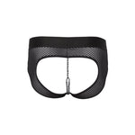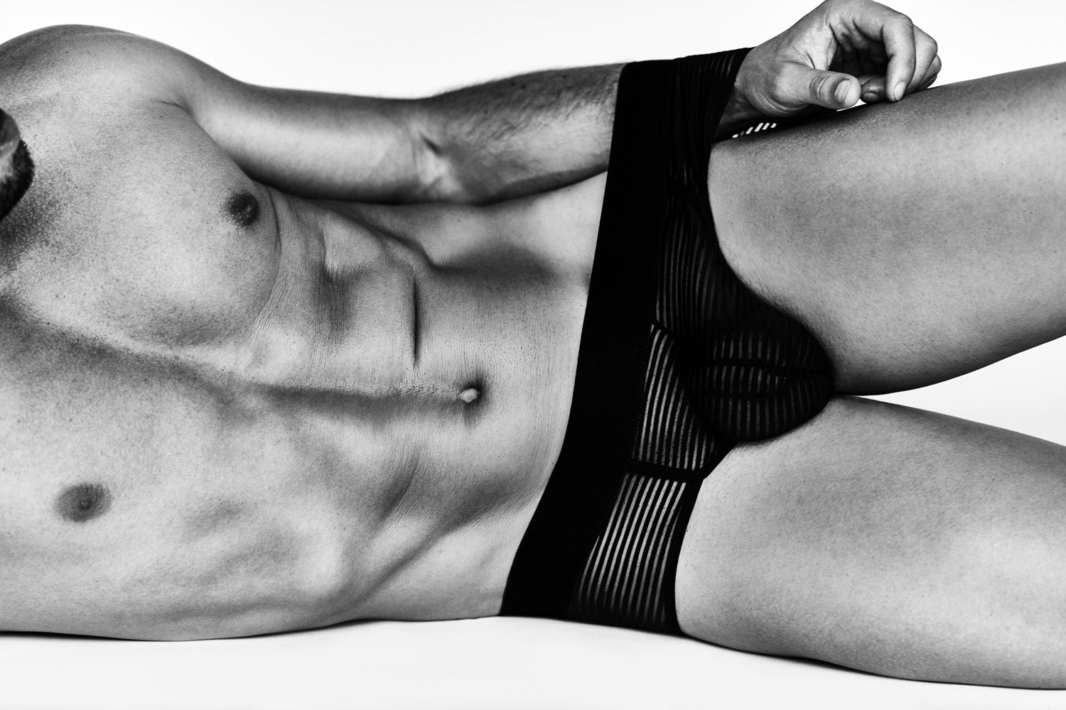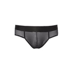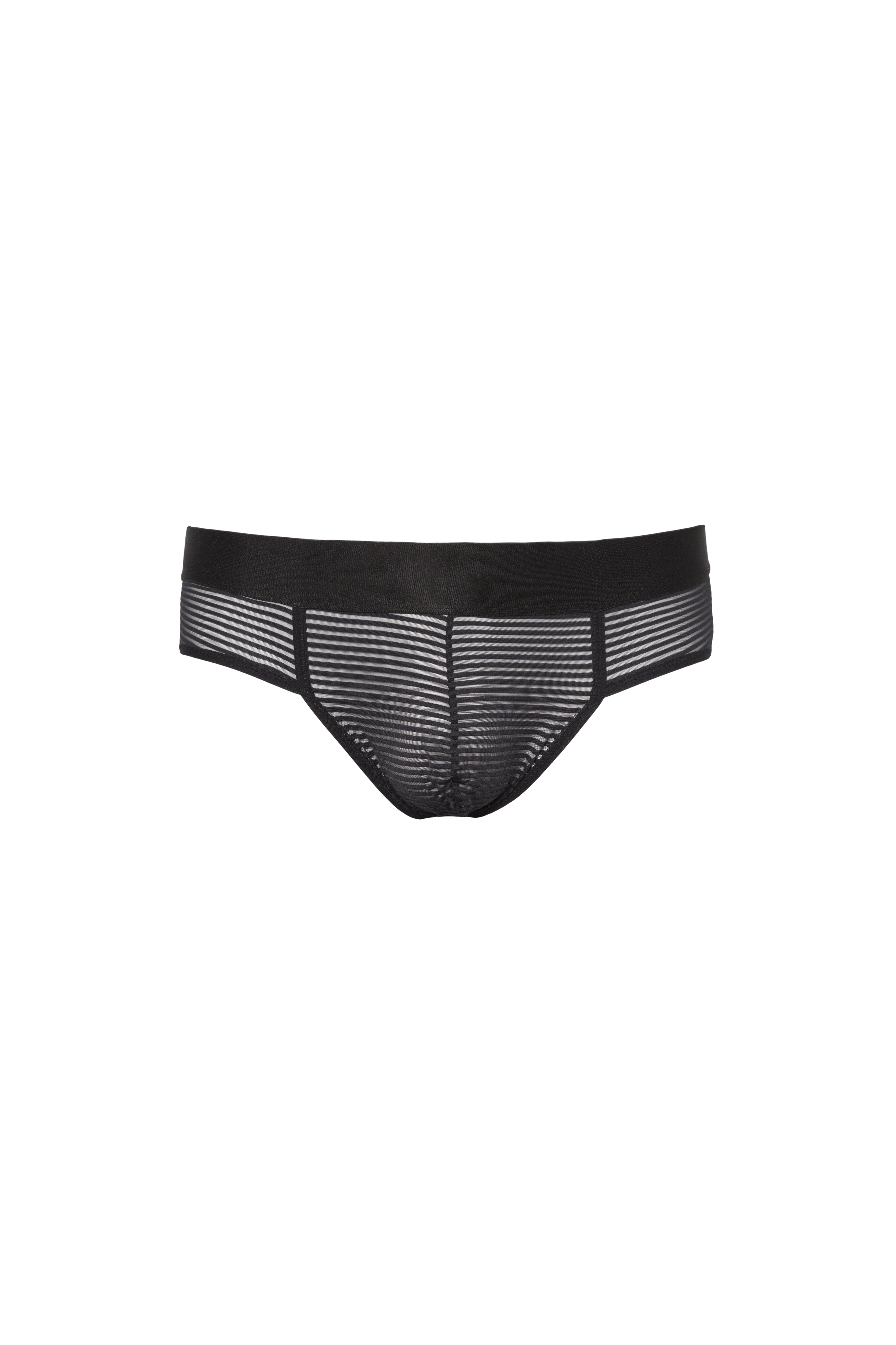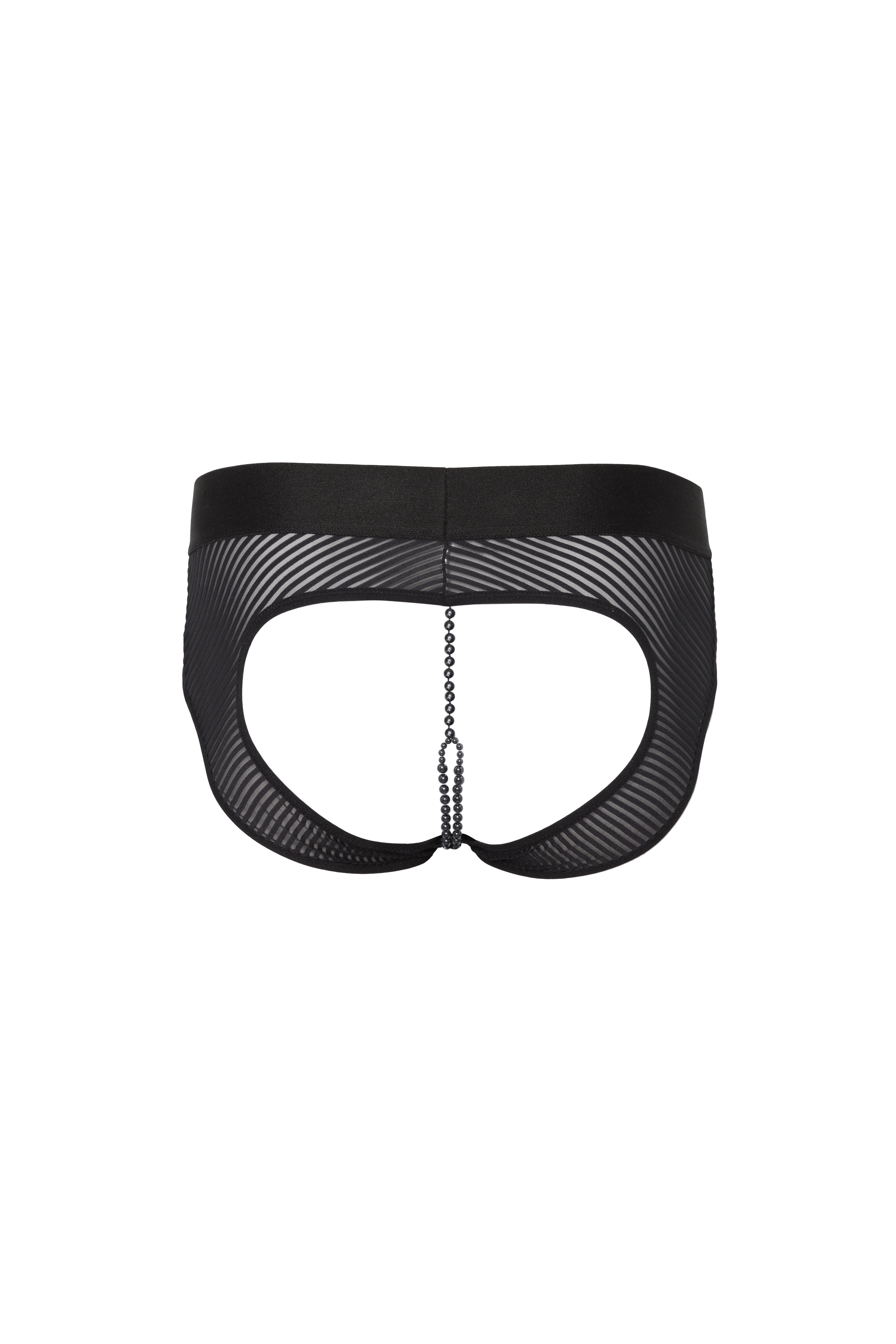 Tokyo Pearl Male Brief made of soft semi-transparent stretch fabric with a striped effect and black elastic straps. It combines the classic and the provocative in a garment that redefines the concept of men's underwear. Traditional and disruptive at the same time, its design provides structure and support, while hiding a powerful erotic secret: the double pearl back necklace.