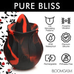 Bloomgasm Black Kiss Rimming Rose, prepare to blossom with pleasure as you take this tongue and let it lick you all over! This wagging tongue is perfect for kissing and licking your nipples, teasing your clit, playing with the head of a dong, or even giving yourself or your partner a rimjob! Made out of silky smooth, premium quality silicone it is phthalate-free and body-safe. Use only with water-based lubricants as you indulge in 3 speeds and 7 patterns of licking! Bring it in the shower, too! It's rated as IPX6 waterproof so it can handle powerful jet streams but should not be submerged under water. Recharge between uses with the USB cable provided. After playing, wash with warm water and mild soap, then spray with a toy cleaner and let air dry.