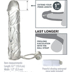 Fantasy X-tensions Vibrating Super Sleeve Clear from Pipedream Products. Turn your penis into an instant pleasure machine with the incredible Fantasy X-Tensions. Now you can be all the man you can be and satisfy your partner with this easy-to-use erection enhancer. Developed as a safe, affordable, non-surgical alternative to expensive medical procedures and pills, your Fantasy X-Tension will give you the biggest, thickest, most satisfying pleasure rod you ever imagined! Perfect for men with erectile dysfunction ED and midway performance problems, your new enhancer will deliver results that both partners will love! The Vibrating Super Sleeve is a life like textured extension that gives you the girth and length to satisfy your lover. It is super stretchy to accommodate most sizes and snug enough to help you last longer. The ball strap holds the extension in place, prolongs ejaculation, and features a powerful micro vibe for explosive climaxes. Your partner will enjoy deeper penetration with the 1-inch extension at the tip, while you watch your dick grow bigger and thicker than ever before through the crystal-clear sleeve! Try it in the shower or spa and turn bath time into pleasure time! Clean-up is a snap after the fun with an adult toy cleaner and warm water. One size fit most. This is extension not a condom. Features: 1 inch extension. Lifelike shape and feel. Powerful waterproof micro bullet vibrator. Ball strap prolongs ejaculation and keeps extension in place. Includes free batteries. Item measurements: length 6.1 inches. Width 1.3 inches. Inner diameter 1.25 inches. Please note shown on dildo, not included. Phthalate free. Made using body safe materials Thermoplastic Rubber TPR Super Sleeve, ABS Plastic Bullet Vibrator. Please note shown on a dildo for how to use, not included. 90 days warranty.