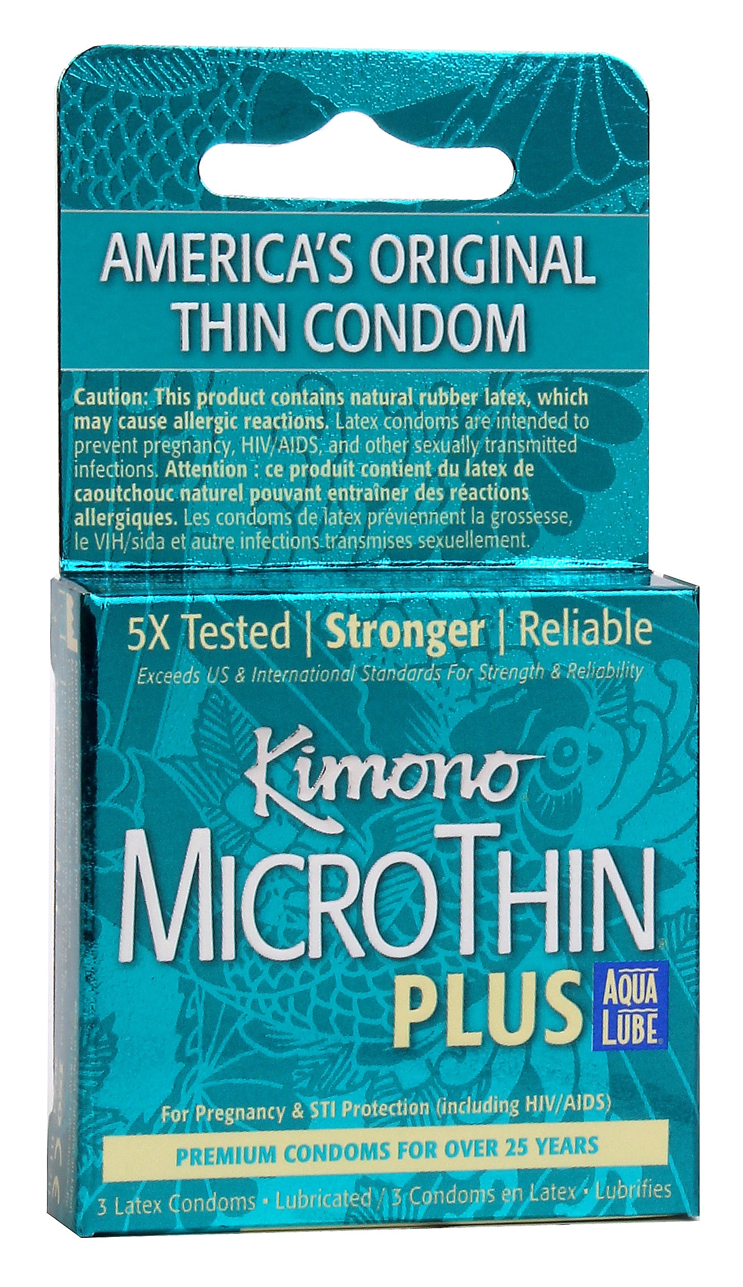 Kimono Microthin with Aqua Lube Condoms 3 pack. America's Original Thin Condoms. 5X tested stronger, reliable. Exceeds US and International Standards for Strength and Reliability! Kimono Microthin with Aqua Lube Condoms 3 Pack. Kimono's thinnest condom combined with their water-based lubricant. Aqua Lube is pH balanced, non-staining and long lasting. Aqua Lube effectively combines with the body's natural lubrication creating instant excitement for both of you. Pre-lubricated with their special proprietary Aqua Lube, these Kimono MicroThin condoms offer a superior barely there feel that is 20% thinner than a leading competitor's thin condom! The cool, refreshing moisture of Aqua Lube promotes a more comfortable and sensually slick experience each time you slide one of these form-fitting condoms on. Kimono MicroThin feels like wearing nothing at all, and promotes more intense sensations during lovemaking, while still ensuring protection against STDs and unwanted pregnancy. These ultra-thin latex condoms are giving a sexy twist to staying safe between the sheets! Type: Latex Condoms Material: Latex Pack: 3 Condoms Special Features: Aqua Lube Lubricated, Ultra-Thin. Safe sex practice, birth control, disease prevention, pregnancy prevent. Sexual wellness. Always practice safe sex. Kimono Condoms are all natural, vegan friendly and no animal or milk proteins. Caution: this product contains natural rubber latex, which may cause allergic reactions.