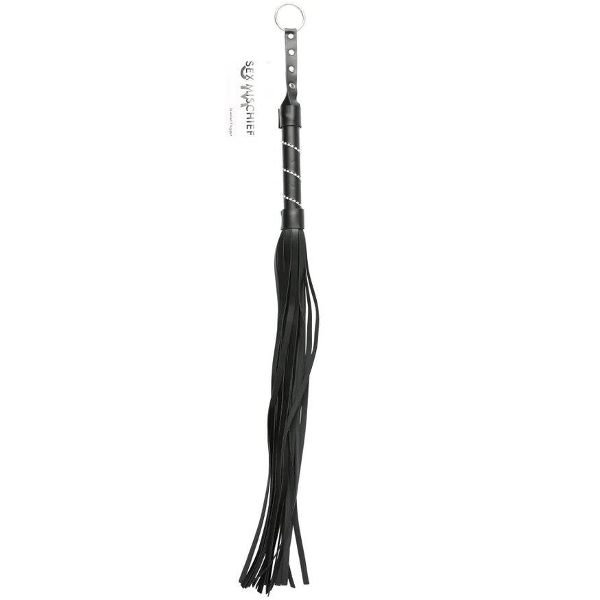 Sex and Mischief Jeweled Flogger. Stroke Me, Stroke Me. Stroke after exhilarating stroke, the flogger was brought down upon my yearning and receptive flesh. At times there was almost a musical rhythm to the frenzy, but it seemed every time I had figured out the pattern, the cadence was changed; sometimes very slightly, other times, maddeningly so. Nevertheless, regardless of the unrelenting crack of the whip, I never asked for it to stop. We both knew our parts, and thank heavens, we both relished in our roles. High-quality, strands are the heart and soul of these fun new whips. Handles with wrist strap help to keep flogger in hand. Your partner will love the unique feel. Whip for role playing and discipline. Whip or caress your partner with this faux leather flogger with jeweled accent. Beautifully designed with practical use in mind. Details length is 30 inches. Materials Vinyl fabric, nickel free metal hardware, wood, plastic. Includes: 1 Jeweled Flogger, 30 inches in length.