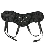 Sportsheets Lush adjustable Strap-On Harness in Black. Plush strap-on harness with interchangeable rubber O-rings: 1.5 in., 1.75 in., 2 in. Includes channel for bullet vibrator.
