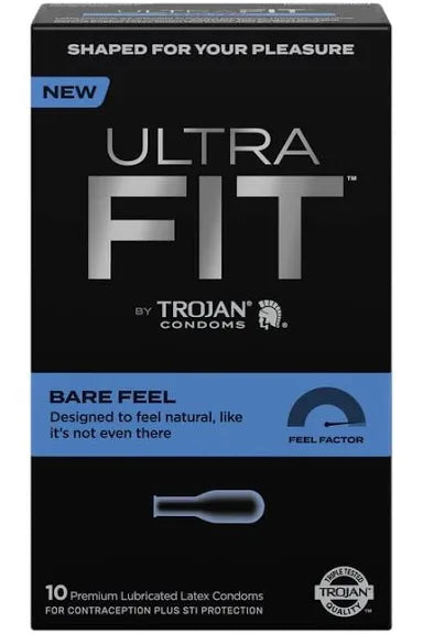 Trojan Brand Latex Condoms Ultra Fit Sensitive Tip 10 Count package. Trojan Ultra Fit Bare Feel condoms are made to feel natural for maximum passion and pleasure. Designed with a snug base yet spacious around the head and shaft for a barely there sensation Bare Feel is part of a premium collection of tailored shapes. Find the feel that fits you best. Shaped for your pleasure. Sensitive Tip feel designed to focus and intensify stimulation at the tip of the condoms. 10 condoms per box. Premium condom for contraception and STI protection.